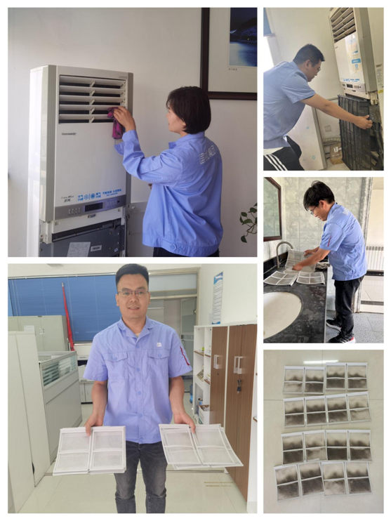 在活動現場,志愿者們分工明確,配合密切,拆卸空調外殼、清洗空調濾網、擦拭空調外機,經過一下午有條不紊的清洗活動,辦公室和會議室的空調從內到外煥然一新?!皼]想到空調濾網這么臟”“太好了,終于能放心開空調了”,看著沖洗出的灰塵污漬,員工們對志愿者助人為樂、無私奉獻的精神紛紛表示感謝和贊揚。
